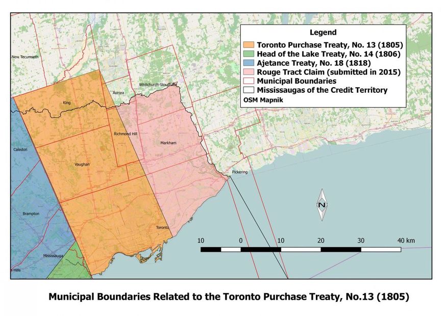Prior to the arrival of British and French colonizers, various Indigenous Nations lived on these lands, today known as "Toronto", to gather resources, serve, and celebrate their communities. Throughout the 17th and 18th centuries, as the British and French begun to settle these lands, the Indigenous maintained generally peaceful relations with the British and French. Their support included trade, friendships, and aid against American invasions of what we call "Canada" today.In 1787, the British Crown distributed £1,700 worth of gifts to the Mississaugas of the Credit as an award for their contributions during the American Revolution. Unbeknownst to the Indigenous, the British also included conditions in that exchange for the Indigenous people's land to be sold to the Crown. This failed and false sale is known as the “Sale of Toronto". In 1805, when it was recognized that the British Crown did not have legal claim to the land, the Crown entered a second purchase agreement to confirm the boundaries established in 1787. For transferring legal claim to the land to the British crown, the Mississaugas were paid 10 shillings for the 250,000 acres of land, which covers much of Toronto today. To this day, many Indigenous people agree that this sale was unjust. This led to the Mississaugas' 1986 submitted claim for compensation. 36 years later, in 2010, the Canadian government reached a settlement to pay the Indigenous people a mere $20,000 per each adult band member.